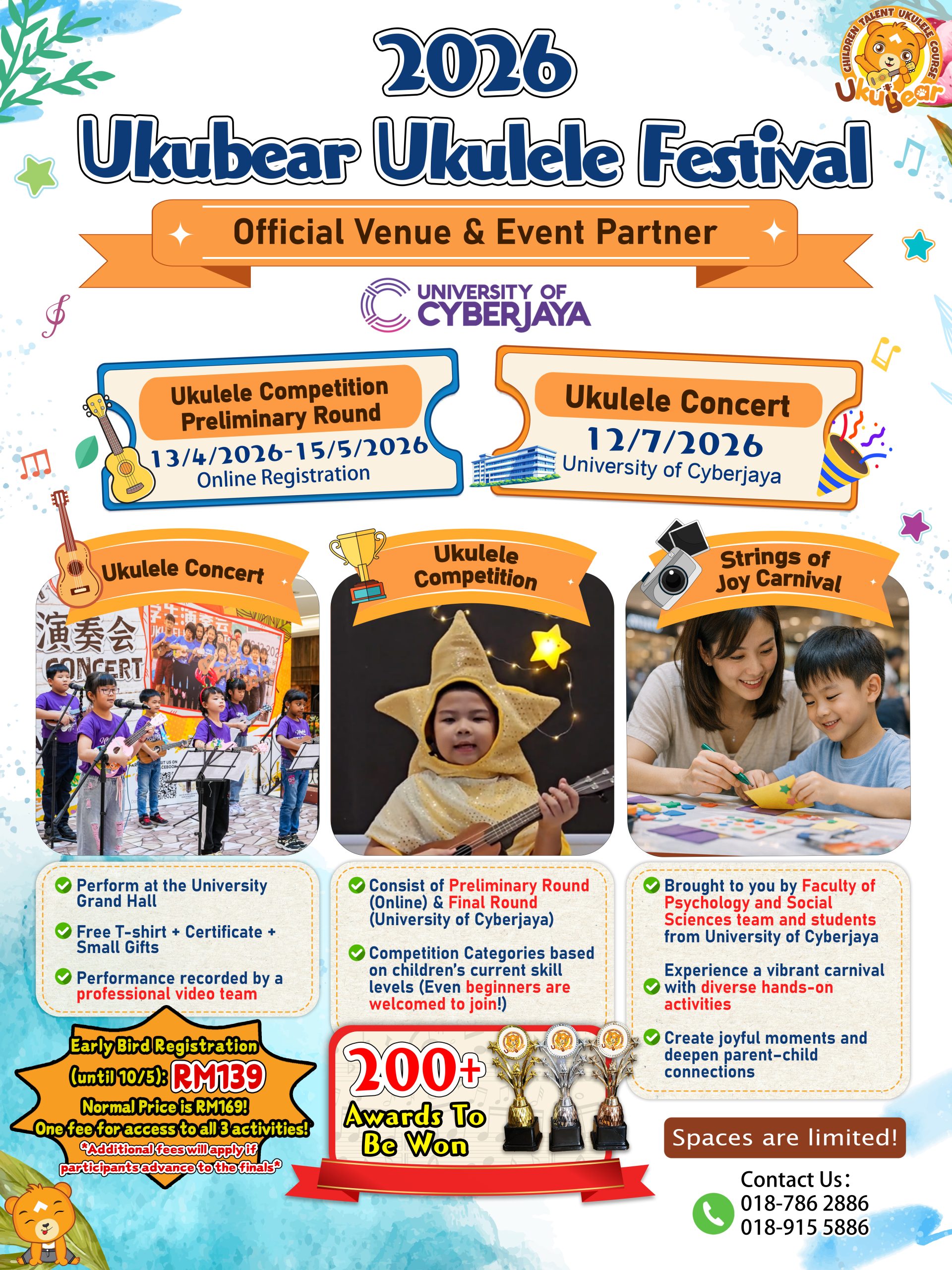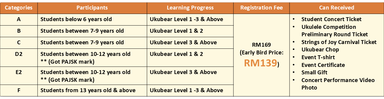 Student Concert Ticket + Ukulele Competition Preliminary Round Ticket + Strings of Joy Carnival Ticket + Ukubear Chop + Event T-shirt + Event Certificate + Small Gift + Concert Performance Video & Photo